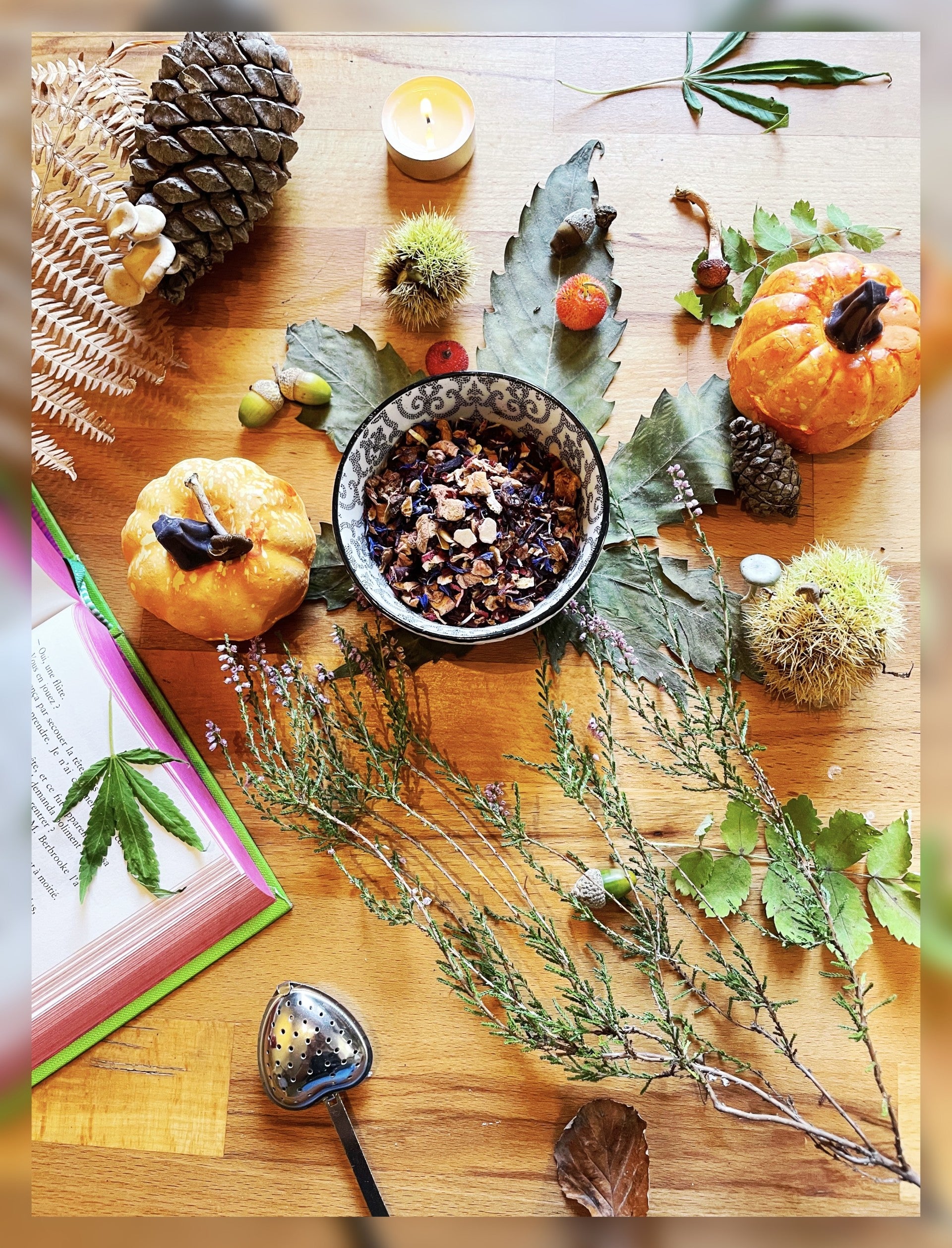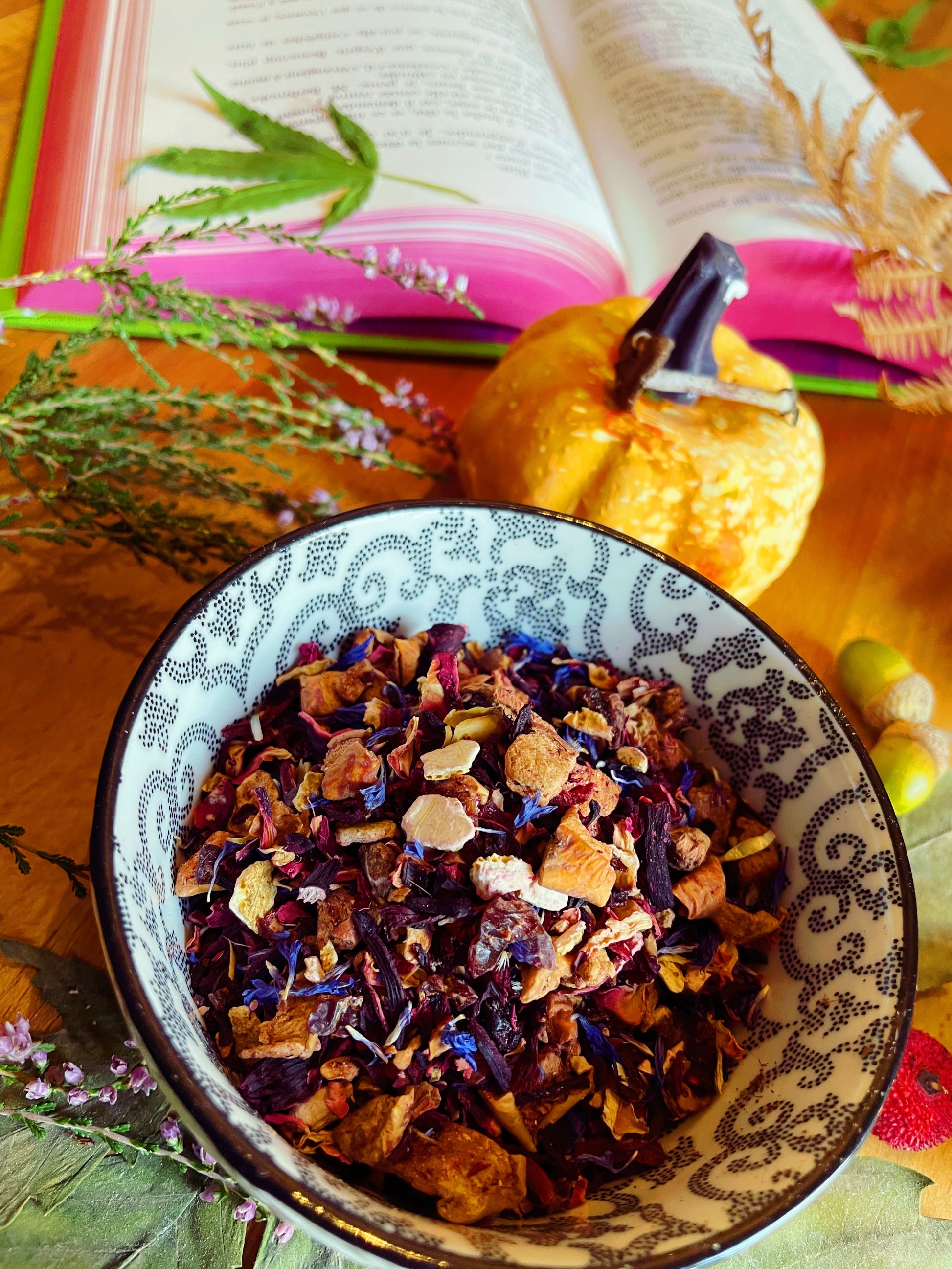 • Ingrédients : Morceaux de Pomme, fleurs d' Hibiscus, zestes d' Orange, Arôme, pétales de Rose, Pêche, morceaux d' Abricots, morceaux de Mangue, pétales de Bleuet, 15% de chanvre